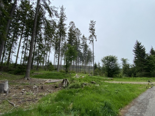 Z Pohorské vsi vyrazíte po silnici směrem na Černé údolí, do kopce. Asi po kilometru odbočíte na lesní cestu (hrubší asfalt) doprava do kopce. Stoupání z tohoto místa je dlouhé asi 1,5 km, většinou půjdete v pohodě pěšky. Po dosažení vrcholu stoupání následuje pěkný sjezd lesem až k Huťskému rybníku (piknikový stůl). Odbočíte doprava podél rybníka po zelené turistické značce, za rybníkem, do kopce.