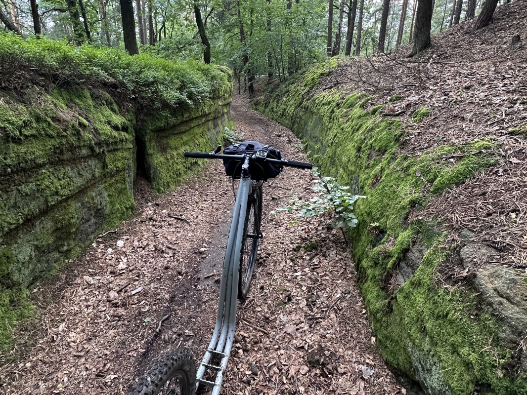 Středně těžká trasa vede ze tří čtvrtin po asfaltových silnicích, hned po prvních kilometrech na Vás čeká náročnější stoupání do obce Kanina. Z jedné čtvrtiny vede trasa přírodním trailem po polních a lesních pěšinách nebo cestách, v této části trasy vyniknou Vaše technické dovednosti s koloběžkou.